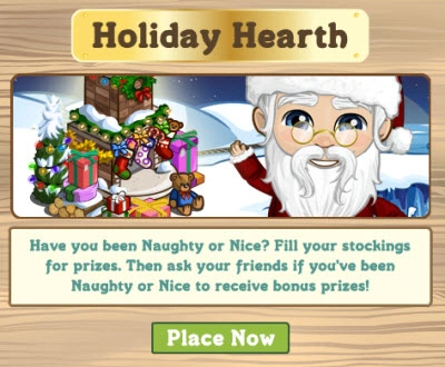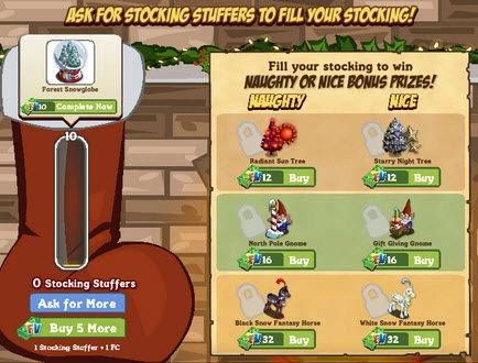 Once you fill your Holiday Hearth with at least 10 Stocking Stuffers, you'll receive a Forest Snow Globe and also one to share with your neighbors. Then, you will have the option to ask your friends if you've been Naughty or Nice by getting votes.